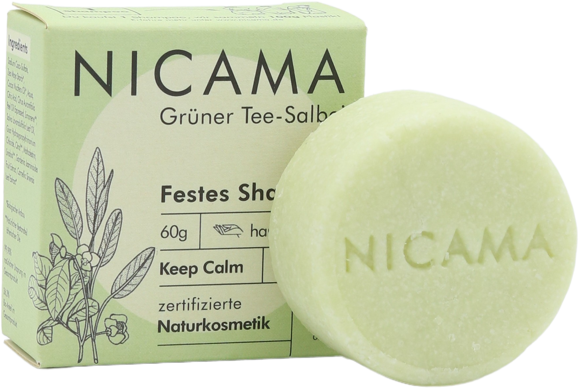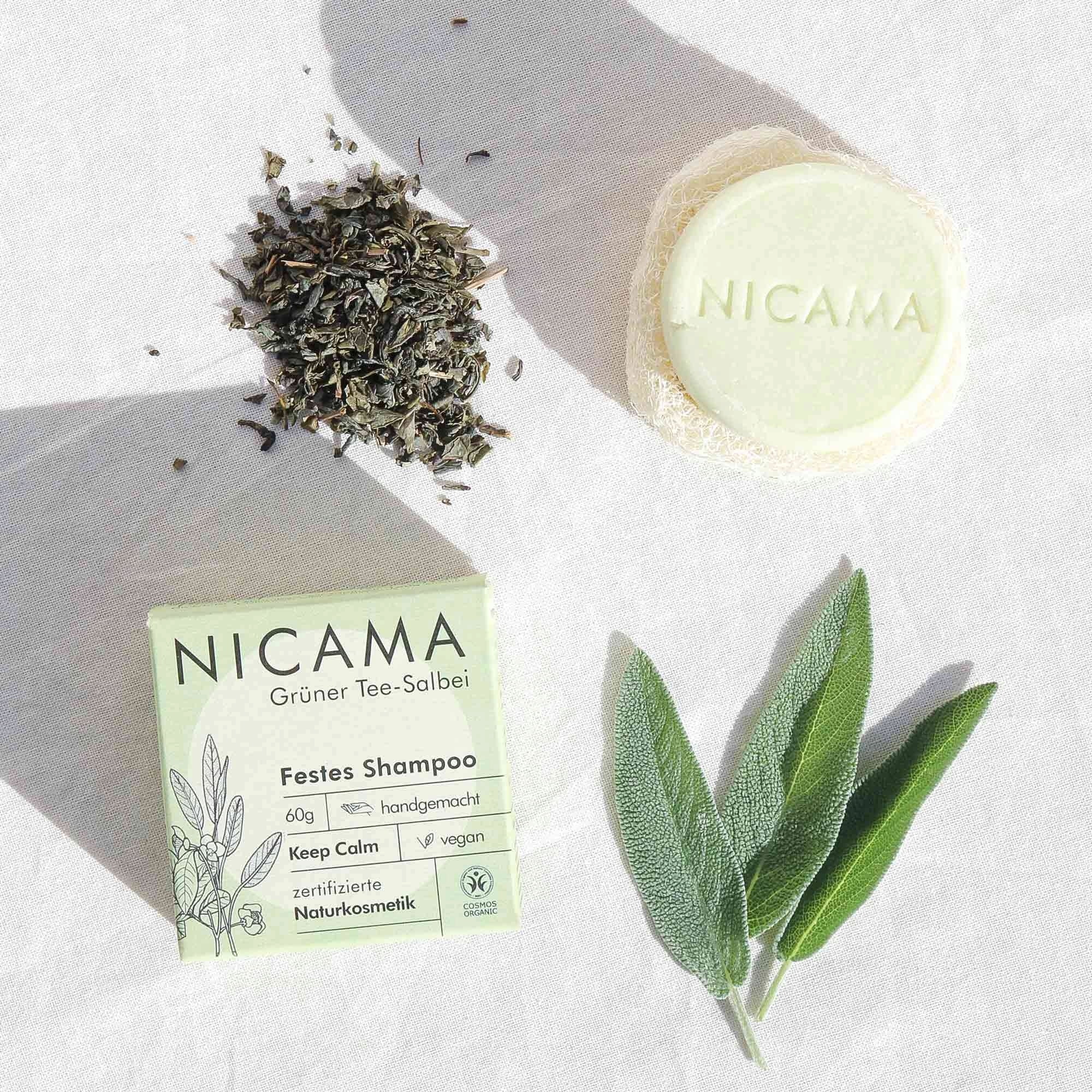 NICAMA Shampoing Solide, Thé vert - Sauge (60 g)
